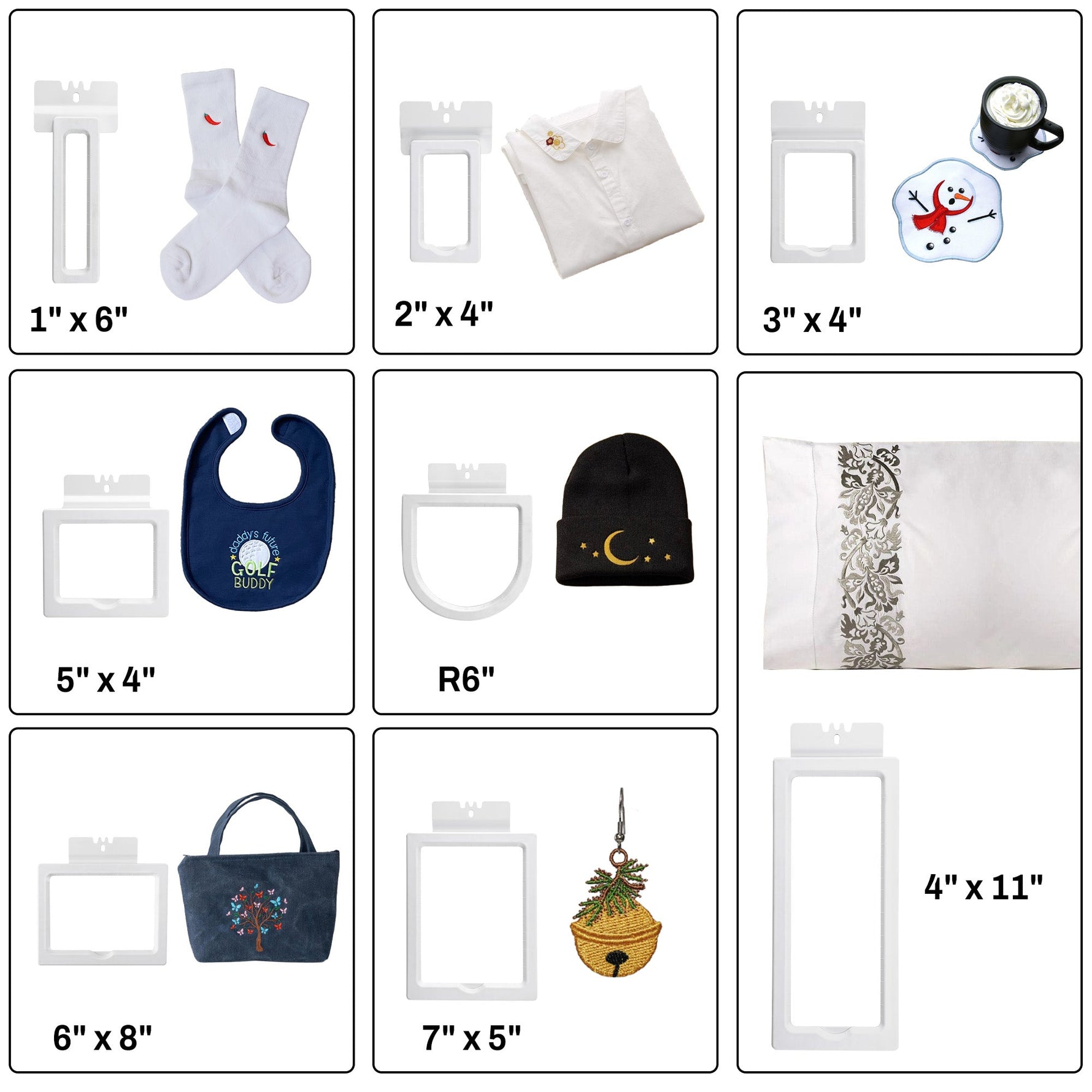 With the 8-in-1 magnetic embroidery hoop set, you can easily switch between 8 size hoops to meet your embroidery needs for different embroidery sizes and different fabric types, including socks, shorts, pockets, bags, T-shirts, etc.